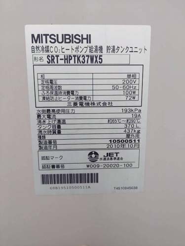 横浜市中区山下町 三菱電機自然冷媒CO2ヒートポンプ給湯機 貯湯タンクユニットSRT-HPTK37WX5→コロナ自然冷媒CO2家庭用ヒートポンプ給湯機 貯湯ユニット CTU-37AZ1K エコキュート交換工事