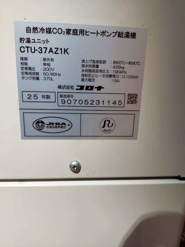 横浜市中区山下町 コロナ自然冷媒CO2家庭用ヒートポンプ給湯機 貯湯ユニット CTU-37AZ1K エコキュート交換工事